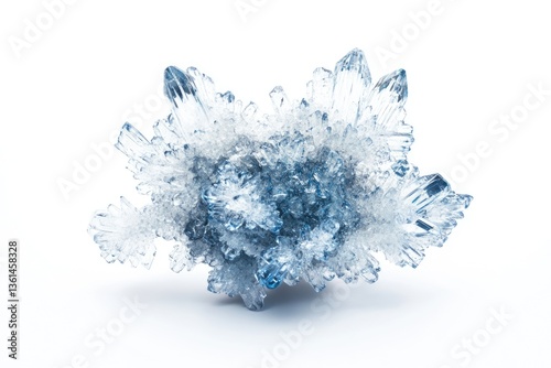 A stunning cluster of blue ice crystals, showcasing intricate formations and sharp points against a white background.