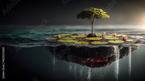 A stunning conceptual floating island resembling a tree of life, teeming with migratory birds against a serene ocean backdrop.