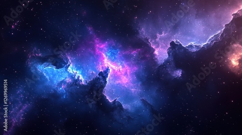 A stunning cosmic view showcasing vibrant blues and purples amidst swirling nebulae and stars in the vastness of space.