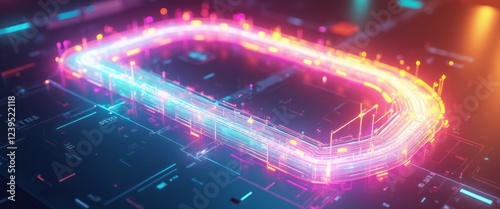 A stunning digital circuit board design glows with vibrant neon colors, creating a mesmerizing visual effect. The intricate patterns and luminous lines evoke a sense of advanced technology and
