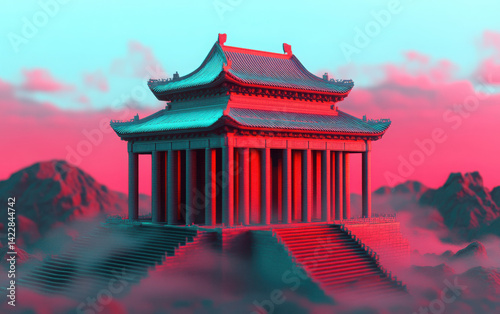 A stunning digital rendering of a mystical temple surrounded by clouds.