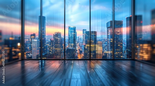A stunning evening view of a cityscape through the large, floor-to-ceiling windows of a modern, blurred office workspace. The city lights create a mesmerizing, vibrant ambiance.