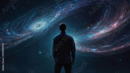 A stunning figure shimmers with celestial beauty as they explore the vibrant depths of a galactic wormhole
