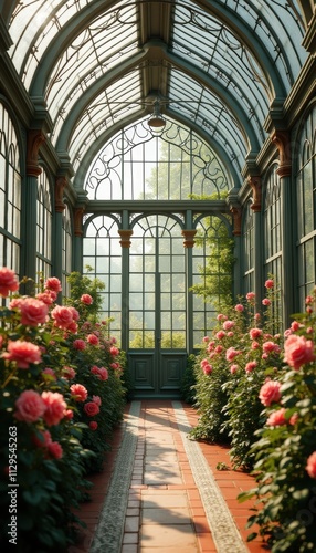 A stunning glass conservatory filled with blooming roses, showcasing the beauty of nature and architecture in harmony. Perfect for botanical and interior design projects.