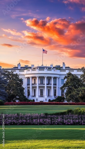 A stunning image of the white house set against a serene sky and the united states flag in view
