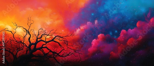 A stunning landscape featuring vibrant clouds, colorful skies, and a silhouetted tree, creating a dramatic and enchanting atmosphere.