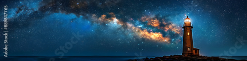 A stunning lighthouse illuminated at night under the Milky Way, perfect for inspiration, travel, and celestial-themed marketing. Vast copy space for text overlay.