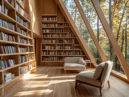 A stunning modern A-frame library with expansive windows offering a beautiful forest view, featuring built-in wooden bookshelves and comfortable seating.
