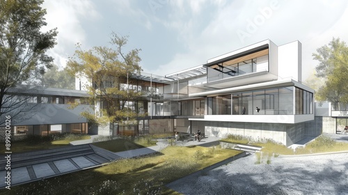A stunning modern architectural complex with sleek glass facades, surrounded by greenery. The design showcases a harmonious blend of indoor and outdoor spaces, creating a welcoming and innovative