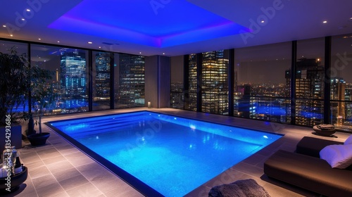 A stunning modern penthouse suite featuring an indoor pool with ambient lighting, providing a relaxing and stylish retreat in the heart of the city.