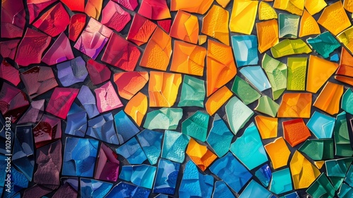 A stunning mosaic features vibrant pieces arranged in a colorful pattern, blending hues of red