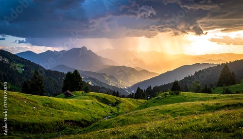A stunning mountain landscape showcases verdant green meadows, forested slopes, and distant peaks under a dramatic, sunlit sky