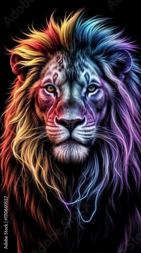 A stunning neon illustration depicts a regal, regal lion with a flowing mane