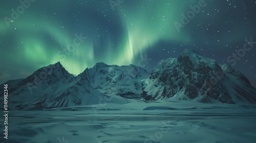 A stunning night scene of the Northern Lights glowing over snow-capped mountains.