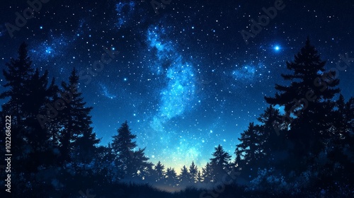 A stunning night sky with a vibrant milky way galaxy shining brightly over a forest.