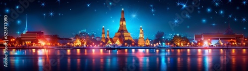 A stunning night view of illuminated temples and buildings reflecting on a peaceful river in an urban cityscape under a starry sky.