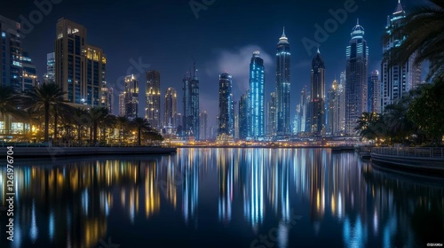 A stunning nighttime cityscape featuring skyscrapers illuminated by colorful lights, reflecting beautifully on the calm water below.