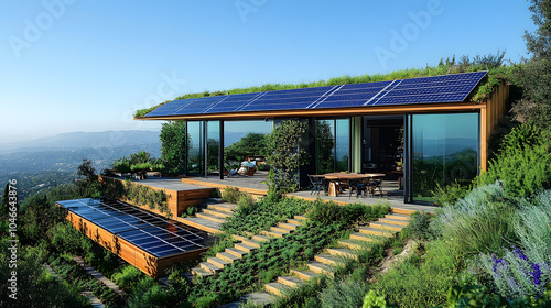 A stunning photography capturing the exterior of a hillside home, with an array of solar panels on the roof absorbing sunlight, framed by lush greenery and clear blue skies.
