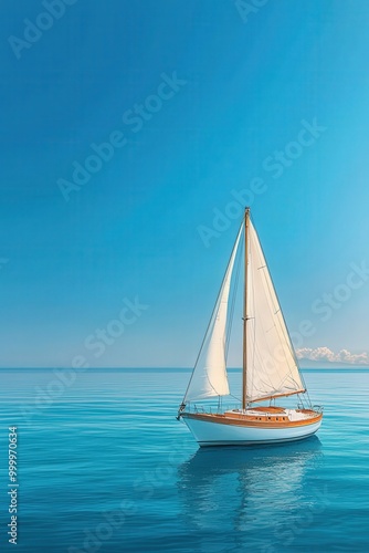 A stunning sailboat glides serenely over calm blue waters, surrounded by a clear sky and distant clouds, perfect for a tranquil getaway.