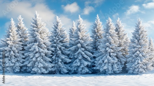 A stunning snowy landscape features a wide field blanketed in fresh white snow, with tall evergreen pine trees in the distance and a clear blue winter sky above, creating a peaceful and tranquil