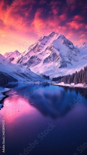 A stunning snowy mountain range reflected in a serene lake