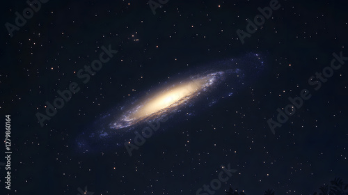 A stunning spiral galaxy dominates a dark night sky, speckled with countless stars. The galaxy's bright core and swirling arms create a mesmerizing cosmic scene.