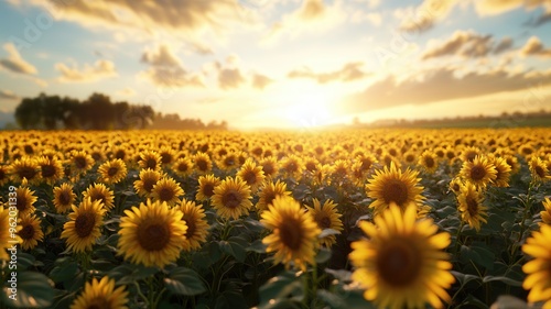 A stunning sunflower field bathed in golden sunlight, capturing the beauty of nature during a bright summer evening.