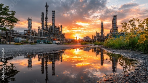 A stunning sunset illuminates the sky with vibrant colors as it reflects in a puddle on the ground. Tall structures of an oil refinery and yellow flowers create a striking contrast.