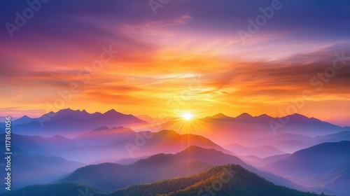 A stunning sunset over a mountain range, with vivid hues of orange, pink, and purple painting the sky above the peaks.
