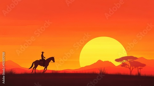 A stunning sunset silhouette of a rider and horse at a safari overlook, capturing the essence of serene adventure in Africa.