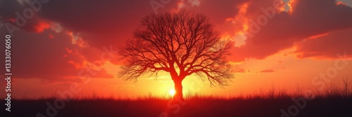 A stunning sunset silhouette of a solitary tree against a vibrant sky. Perfect for themes of nature, solitude, and tranquility in design projects.