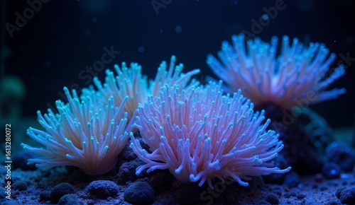 A stunning underwater scene of a bioluminescent coral reef at night, radiating teal, purple, and pink hues in crystal-clear water., ultra detailed, 8k resolution, HDR, professional