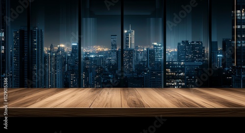A stunning view of a city skyline at night, highlighted by illuminated skyscrapers and a wooden floor in the foreground