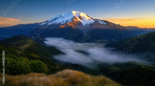 A stunning view of a snow-covered mountain rises above a lush valley, with soft clouds swirling around at sunset. The landscape radiates calm and serenity