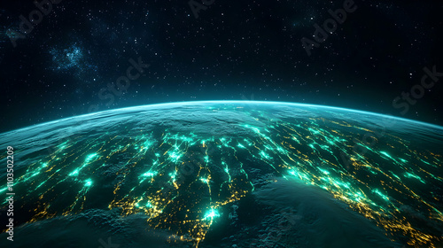 A stunning view of Earth from space, glowing with vibrant city lights and interconnected networks, showcasing the beauty of our planet at night.