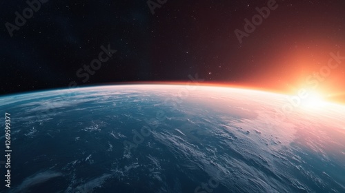 A stunning view of Earth from space, showcasing its curvature and the glow of sunrise illuminating the horizon.