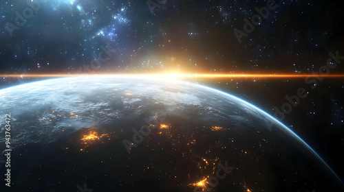 A stunning view of Earth from space, with a bright light illuminating the horizon, surrounded by stars.