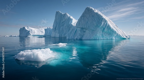 A stunning view of large icebergs floating in clear blue ocean water, showcasing the beauty of nature's icy formations.
