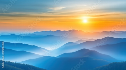 A stunning view of the Blue Mountains with layers of hazy blue ridges stretching into the horizon under a golden sunset.