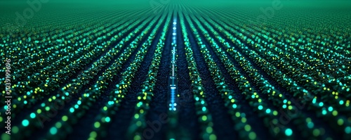 A stunning visual of an endless field of glowing green dots representing data points and connectivity in a digital landscape