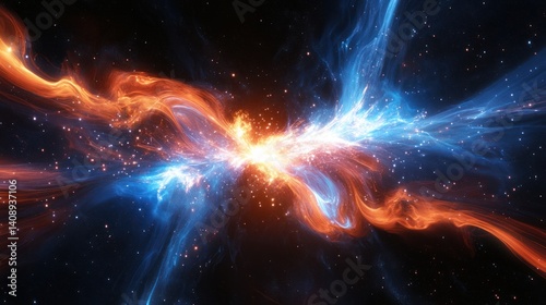 A stunning visual of cosmic energy, showcasing vibrant blue and orange hues colliding in a mesmerizing dance of light and particles.