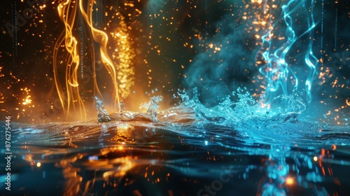 A stunning visual representation of fire and water elements coexisting, showcasing vibrant orange flames and cool blue water in dynamic motion.