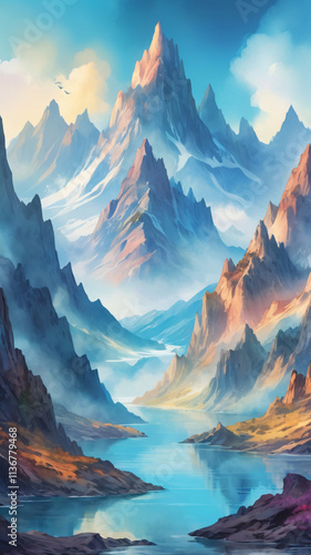 A stunning watercolor painting of a mountain landscape