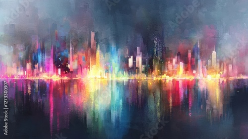 A Stunning Watercolor Painting of a Vibrant Cityscape Illuminated by Nighttime Lights and Colors
