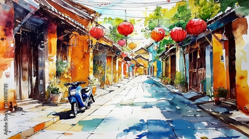 A stunning watercolor view showcasing the beauty of Hoi An, Vietnam.
