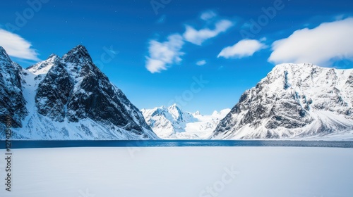 A stunning winter landscape featuring towering snow-covered mountains under a clear blue sky, with a serene frozen lake in the foreground.
