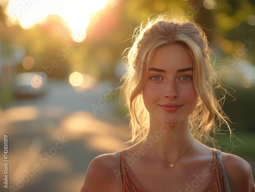 A stunning woman exudes confidence and beauty as she poses for a photo shoot outdoors, her long brown hair cascading down her neck, accessorized with a fashionable lip color and a touch of sun-kissed