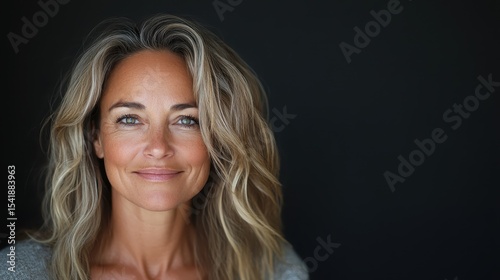 A stunning woman with flowing hair smiles radiantly against a dark background, exuding confidence and warmth in this captivating portrait that showcases natural beauty.