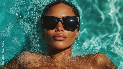 A stunning woman with sunglasses swims gracefully in a pool, creating captivating ripples of water, conveying a sense of luxury, relaxation, and summer vibes.