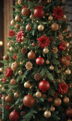 A stunningly decorated Christmas tree is adorned with intricately carved wooden ornaments and a delicate floral pattern, floral pattern, holiday decor